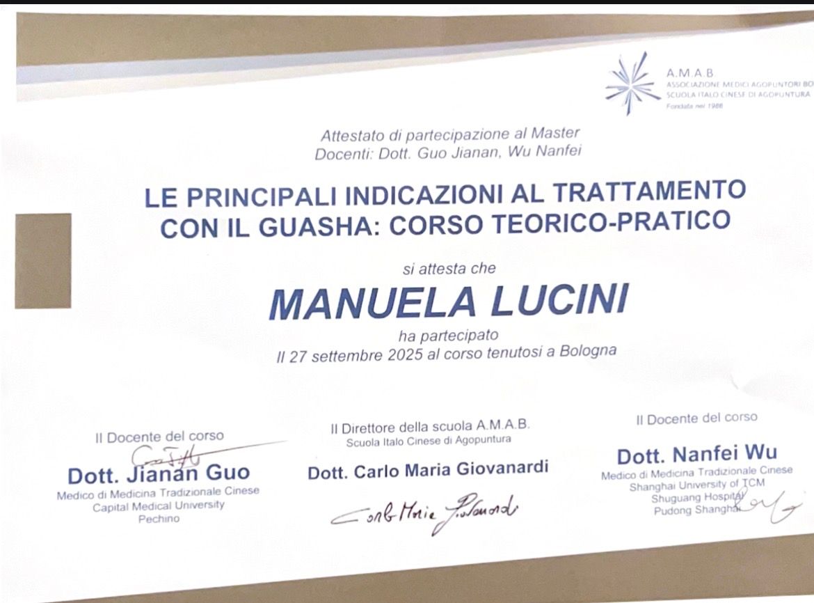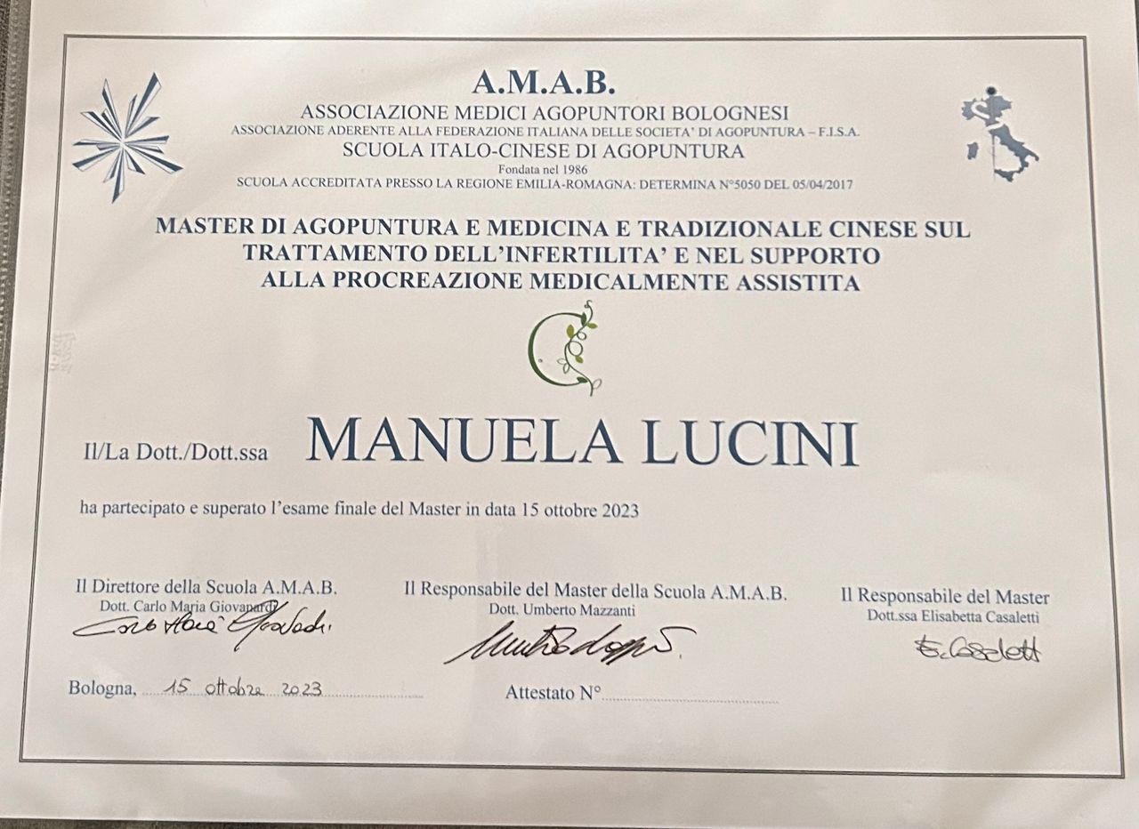 Nel 2021 ho conseguito il diploma di Agopuntura presso la scuola AMAB di Bologna, equivalente a master secondo livello.